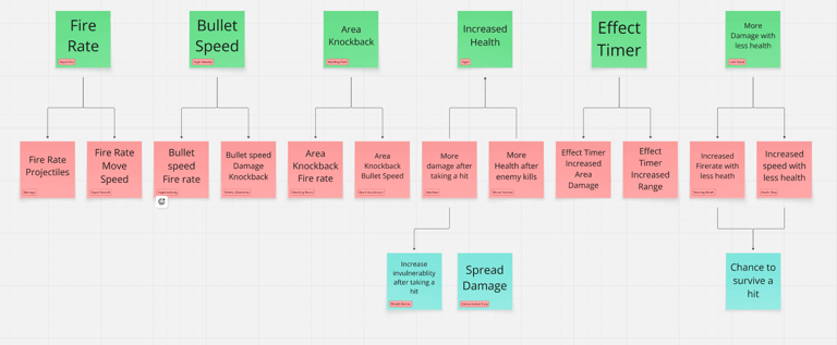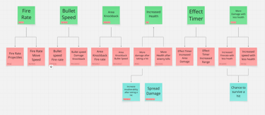 In 20 Minutes Till Dawn, they have mini upgrade trees that follow a specific effect family and I wanted to try something similar. Here I made upgrades trees based off of the upgrades I made for prototype 1.