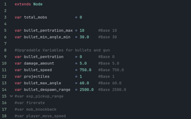 I was worried intially about the upgrades because I haven't made a system like this before but it ended up being easier than I thought. Most of the upgades came naturally from variables already set in the game, like player speed and fire rate. There were a couple I created, such as the bullet fan for a shotgun, and penetration.