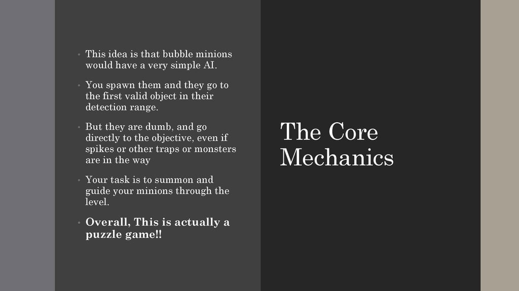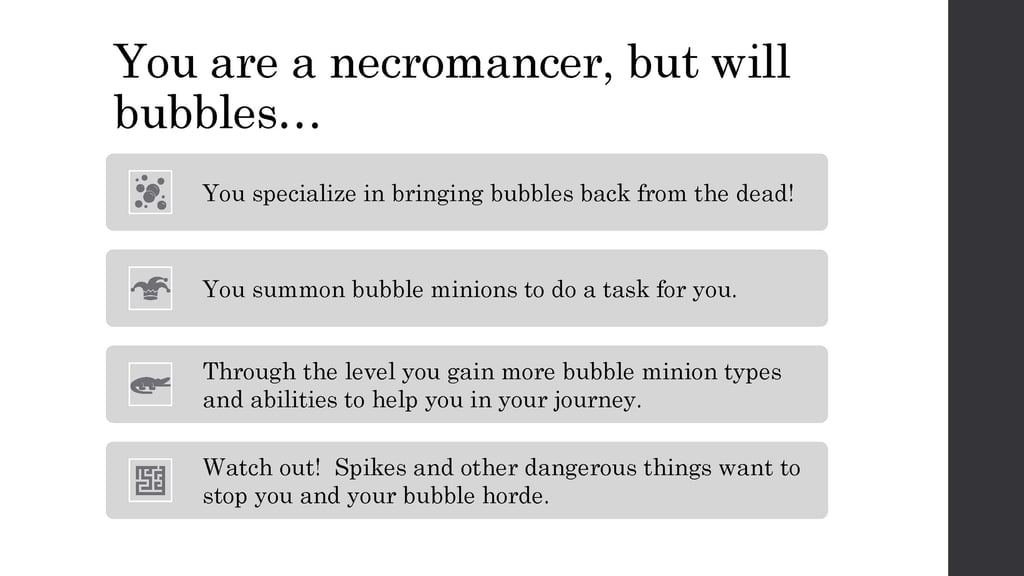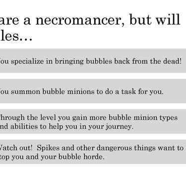 The objective of the game is to destroy nodes to rescue your trapped fish companions. Players can summon bubble minions, which automatically detect and pathfind toward the nearest node to destroy it. If no nodes are nearby, the minions will follow the player until the level is completed.