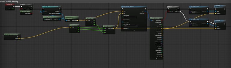 One of our team members implemented a line trace from the Bubblemancer to the mouse-clicked location to determine line of sight. However, we encountered a bug where the mouse cursor would teleport or disappear when hovering over certain objects. This issue arose because both the "get location under mouse" function and the Bubblemancer’s line trace used the same trace channel. I resolved this by reworking the code and creating a separate trace channel to independently track the mouse position and the Bubblemancer’s line of sight.