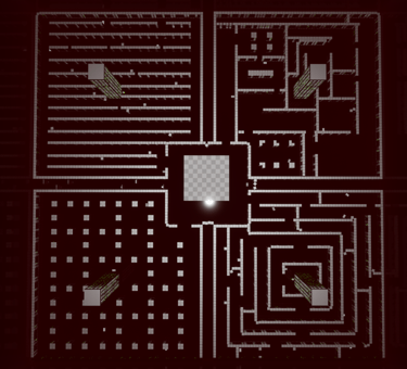 Learning from the first prototype map, I wanted to create more location hierarchy. I also wanted to provide the player with a navigation point so they could stay oriented in the maze.