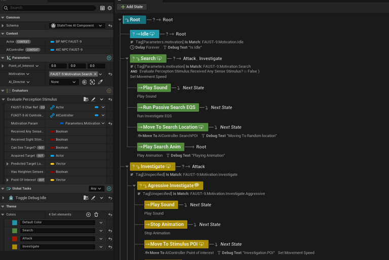 Faust’s main AI brain is built using Unreal Engine’s state trees. These have the advantage of being more efficient than traditional behavior trees and appear to be the preferred system Unreal recommends for AI development.