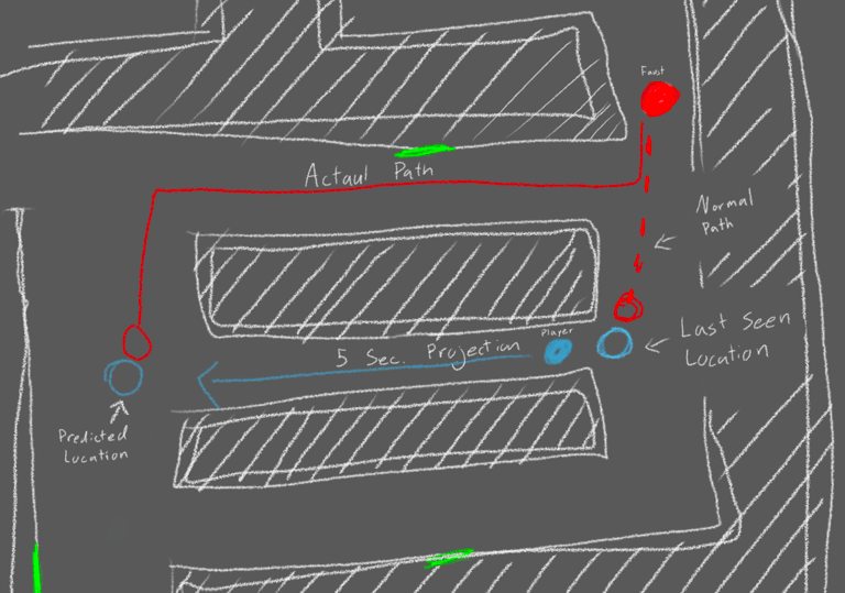 Instead of heading to the last known location, Faust moves to the projected point. This enables the AI to anticipate the player’s movements, cut them off, or approach from unexpected angles, making encounters more challenging and dynamic.